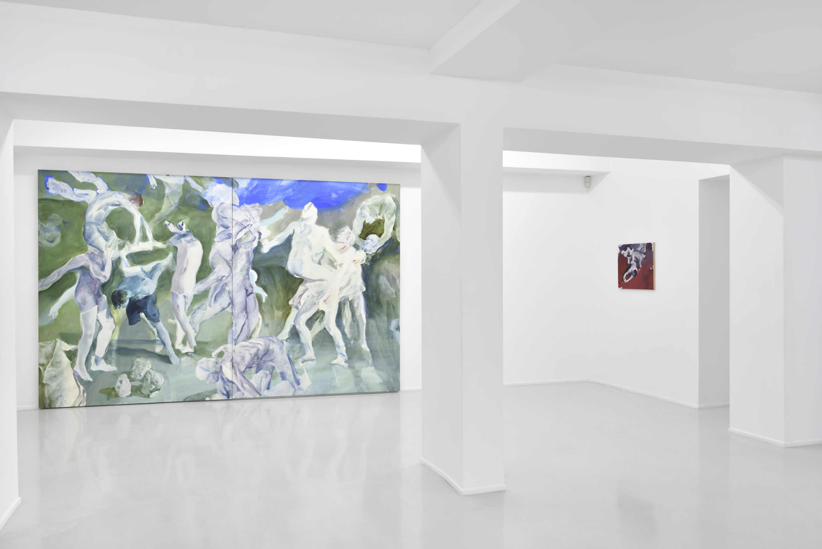 During a six-month residency in Paris, Alin Bozbiciu went to the opera frequently. A conversation with Romeo Castellucci led him to create works he entitled After the Sacrifice, a reference to the story of Cain and Abel. The series Performing Doubt, part of which is on display at the Galerie Suzanne Tarasieve, is an extension of his Parisian work on opera. The composition of certain paintings is inspired by masterpieces of art history: Géricault’s Raft of the Medusa, Poussin’s Abduction of the Sabines, Caillebotte’s Raboteurs de parquet (The Parquet Planers), Roman bas- reliefs.