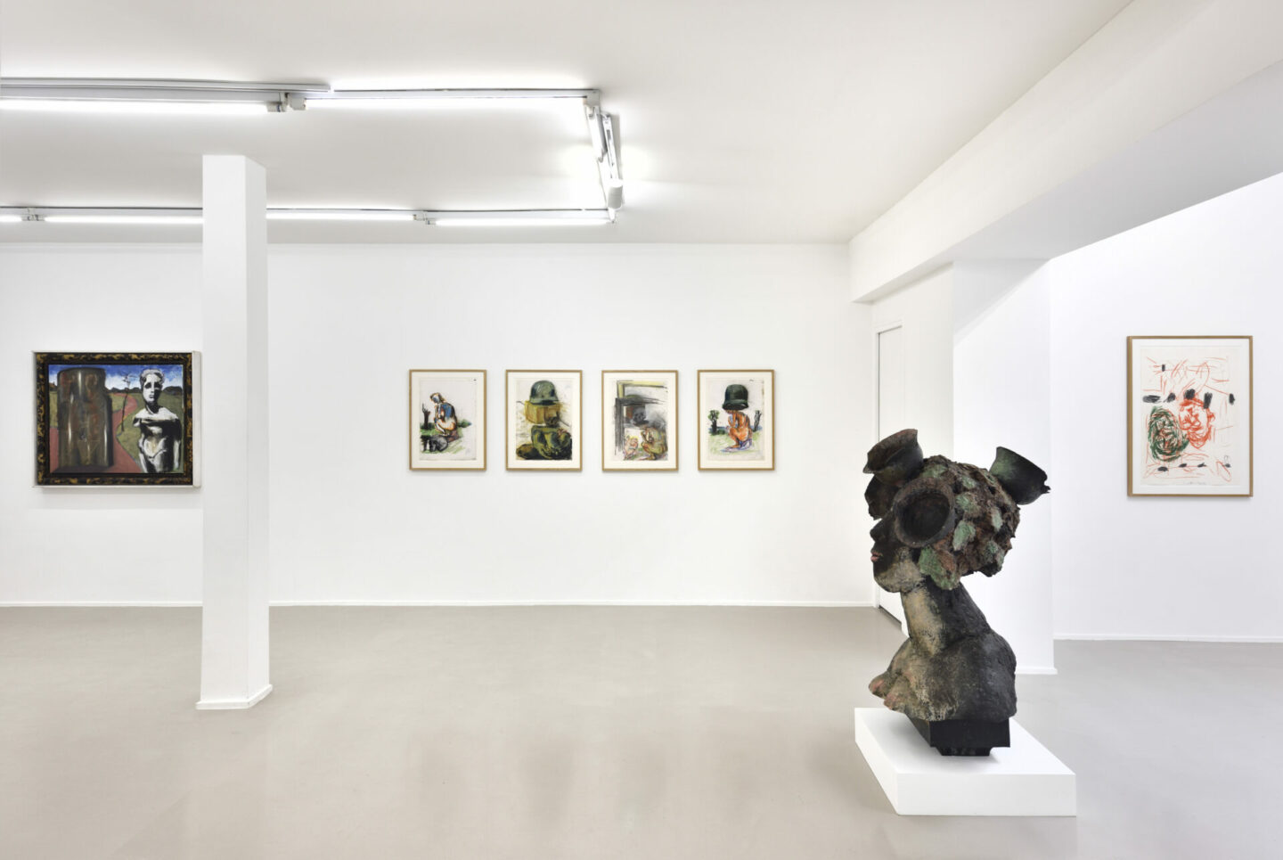 © Rebecca Fanuele S’il faut chercher un point commun entre des œuvres aussi différentes que celles sélectionnées pour cette exposition en hommage à Suzanne Tarasieve, on peut souligner le simple fait qu’il s’agit d’œuvres sur papier accompagnées de quelques sculptures en bronze. En effet, pour chacun de ces artistes, Jörg Immendorff, Markus Lüpertz, A.R. Penck, Georg Baselitz, Sigmar Polke, dessiner ou peindre à l’aquarelle ou à la gouache, sur papier ou sur carton, correspond à une pratique qui revient à transformer ce qui a pu être conçu et figuré sur une toile ou affirmé dans le bronze.