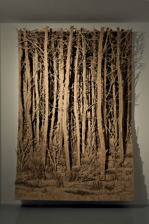 Similar to the decor of a long-forgotten dream, Eva Jospin’s works possess a singular power of suggestion. Alone facing these forests, the viewer cannot help but let his mind wander. Such is the case with forests in which we, literally, lose ourselves. The ambiguity of these works, inspired as much by classical landscape painting, as by land art, resides, among others, in their plural identity: at the same time a painting, a sculpture, a high relief… To look at each new creation by the artist is just as visual as it is immersive. Beyond this sensory experience, these works also function as a screen on which everyone is likely to project his/her own interpretation: isn’t the forest a place of infinite possibilities? In any case, this is what fairy tales have taught us.