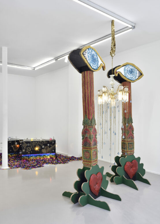 "Le cœur se brise, le cœur se bronze", 2024 Totem en bois et textile, luminaire / Wood and textile totem, lighting 250 x 250 cm (98 3/8 x 98 3/8 in.)