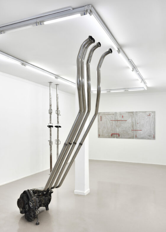 « Fritz », 2025 Moteur, acier / Motor, steel 300 x 100 x 100 cm (118 1/8 x 39 3/8 x 39 3/8 in.) — « L’équilibriste », 2024 Acier, plâtre, charbon / Steel, plaster, charcoal 274 x 52 x 23 cm (107 7/8 x 20 1/2 x 9 in.) — « Gurême », 2025 Aluminium 100 x 200 x 5 cm (39 3/8 x 78 3/4 x 2 in.)