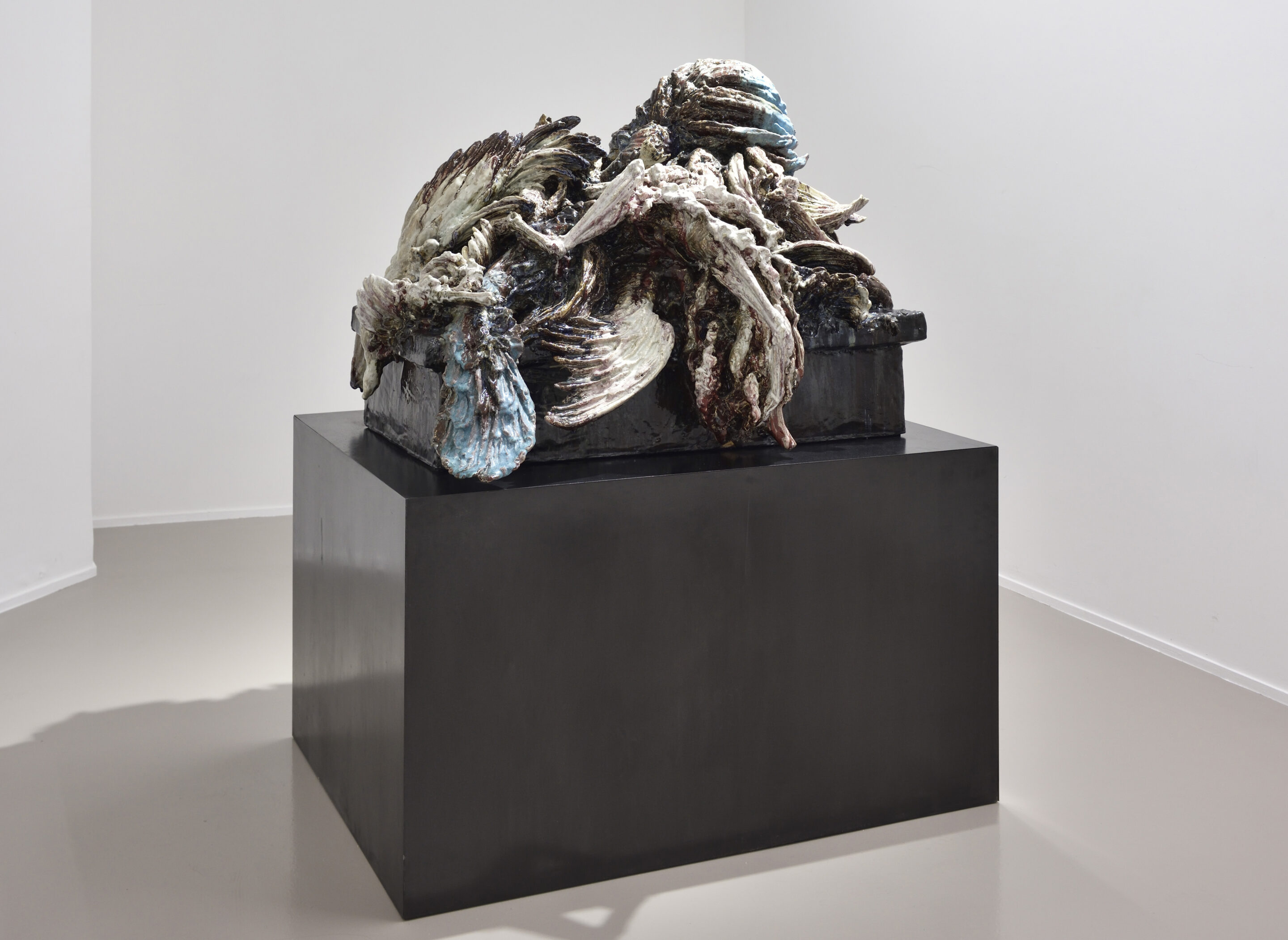 Pour sa quatrième exposition à la Galerie Suzanne Tarasieve, Anne Wenzel poursuit son exploration du délitement des symboles du pouvoir. Son œuvre vise à recréer des monuments à travers un vocabulaire qui apparait d’abord comme classique : bustes, bas-reliefs, natures mortes, bouquets de fleurs. Mais les monuments d’Anne Wenzel n’élèvent pas leur sujet, ne le sacralisent pas : sa verticalité à elle est descendante, elle vise le sol.