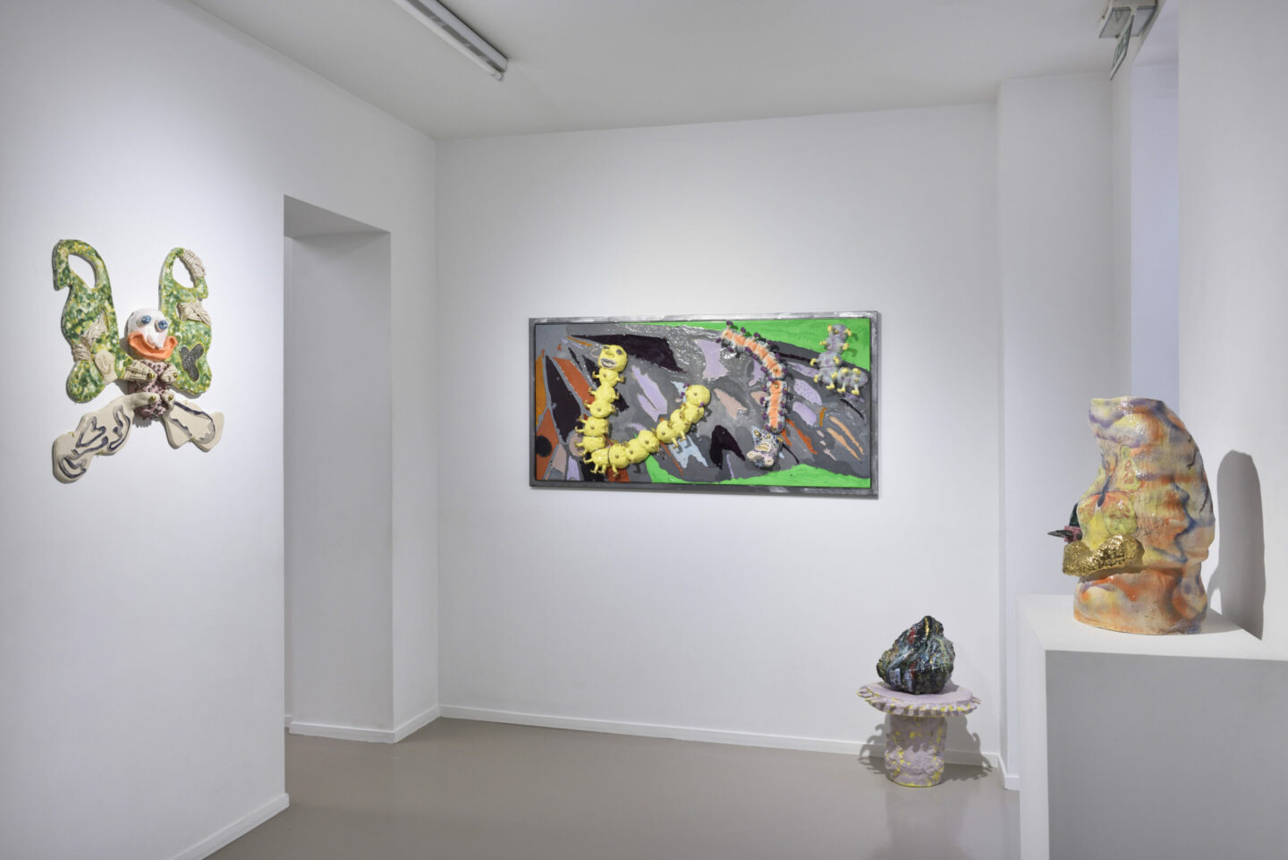 In his almost painterly approach to ceramics, Degorce-Dumas articulates several degrees of effect, from smooth to grainy and from matte to glossy, and plays on the attraction exerted by this dazzling pomp on the eye and the heart. These punk butterflies parade. But their outward luxuriance is also tinged with repellence: they are viscerally crisscrossed by sloth’s claws, disgusting cockroaches, and gaping wounds covered by children’s plasters. In fact, the flashy junk is consumed by the humor of these wounded, slouching figures, although this fragility is not synonymous with prudishness.