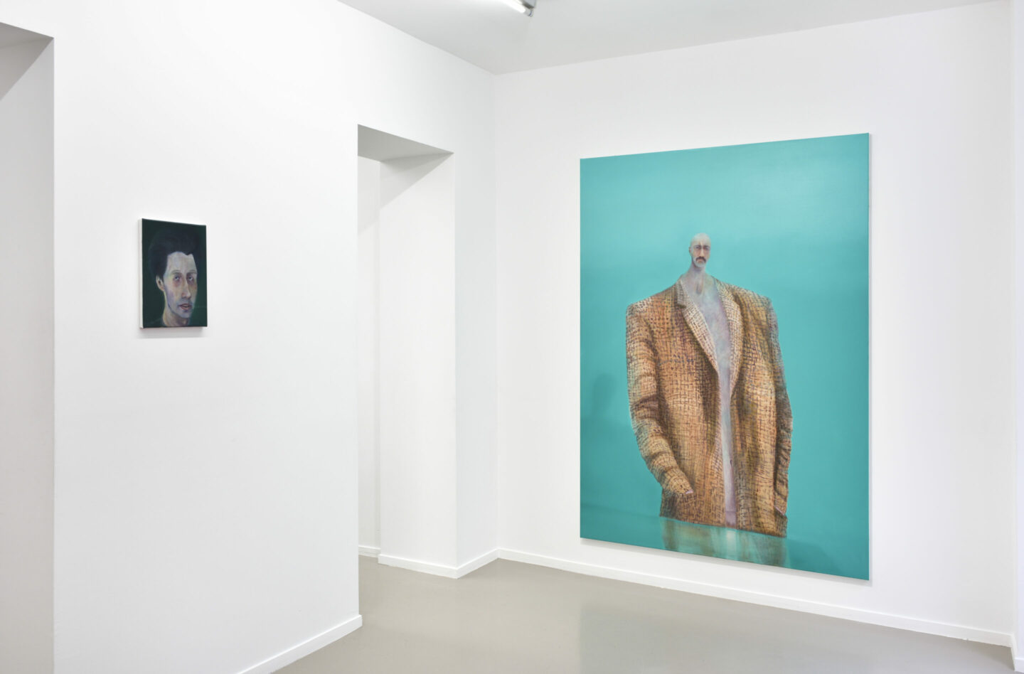 What if the entirety of Gauthier Hubert’s work was nothing but decoys and false pretense? Of course, the extreme rectitude and meticulousness of his painterly style and language, as well as the astonishing precision and accuracy of the situations and figures he insists on depicting, suggest, conversely, his immoderate, almost obsessive passion for description and verisimilitude. The titles of his works, particularly studied and detailed, prove this: from Portrait d’un homme n’ayant ni queue ni tête (Portrait of a man with neither head nor tail) to Un grand homme avec une petite tête, sans chemise, sans pantalon, devant une table lustrée (A tall man with a small head, no shirt, no pants, in front of a glossy table) to Un homme tentant de glisser une soucoupe sous une pile de tasses et sous-casses en alternance afin de représenter une colonne vertébrale (A man attempting to slide a saucer under a stack of cups and saucers to represent a spine). Like perfect “headers,” each of them, most often thought out and written with the utmost care even before the production of the corresponding painting, possesses a genuine programmatic and protocol value.