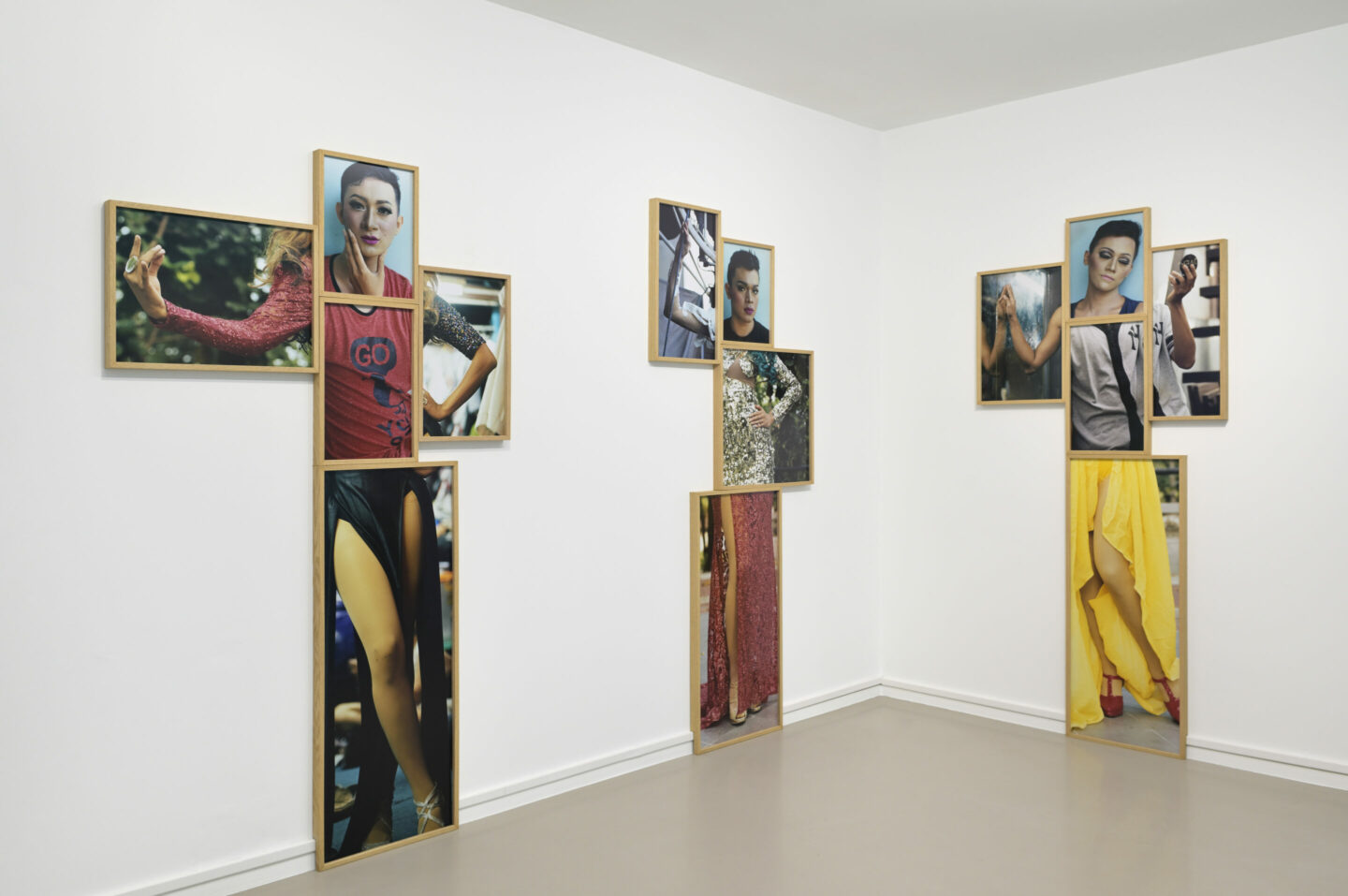 L’exposition se compose d’images issues de cette série ainsi que de trois Totems. L’animal-totem, ici le papillon, devient le théâtre symbolique de la métamorphose. Célébrant et déployant cette idée de construction de l’identité par facettes, par glissements, par mutation, une identité littéralement bricolée à la main : sourcils collés à la colle UHU, fond de teint appliqué en dizaines de couches sur l’épiderme, mousse glissée sous les robes pour courber les hanches, superpositions de collants donnant du galbe à une jambe, lentilles bleues apposées sur les iris.