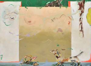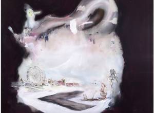 Tuori fashions her dreamy, magical landscapes through looping, undulating swathes of oil paint. She thins her oils and applies with a broad brush to give surprising depth and suggestions of perspective within a simple stroke. There is little sense of horizon in Tuoriʼs curious terrains, where horizontal and vertical plains hover back and forth, painted in saturated subaqueous, dirty ochre and vanilla colours. These suspended worlds flip between glinting night scenes and snowy day scenes, peopled by lingering, unobtrusive protagonists. Tuoriʼs cast of characters is painted in a fine, delicate hand and feel like miniatures through the play of scale in brushwork between figure and ground. The human characters are wraithlike with indistinct features. They appear to do little, observing and hanging around, accompanied by Finnish forest animals; squirrels, horses, owls and rabbits, a deer head, fairground paraphernalia and a snowmanʼs head with a Pinocchio-type nose.